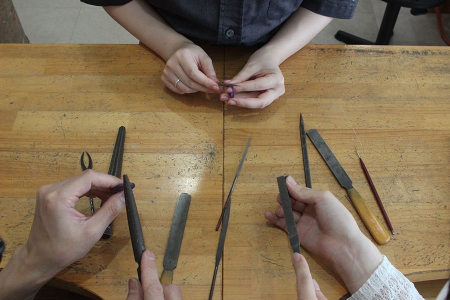 例えば、リングを金属の棒から叩いて丸めるときや、ヤスリで削るときも、職人が丁寧に説明して、難しいところなどはアドバイスしてくれます。「ちょっと歪んでしまったかも」というときも、必ずプロがチェックして補正してくれるため、仕上がりが大きく崩れる心配はありません。