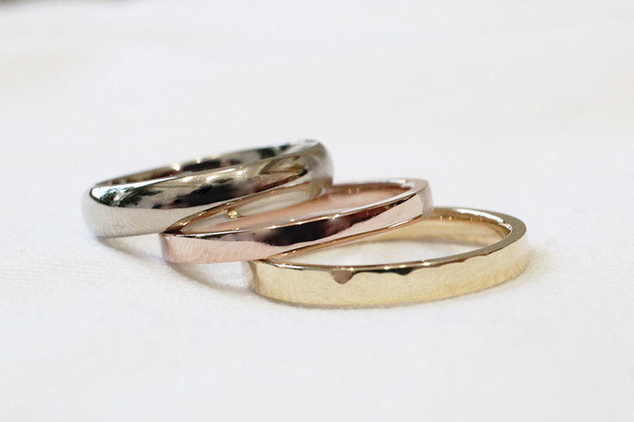 手作り指輪の工房では、結婚指輪や婚約指輪に一般的に用いられるプラチナや18金(イエローゴールド、ピンクゴールド、ホワイトゴールド)が用意されています。これらは既製品のブランドリングとまったく同じ素材であり、耐久性・変色のしにくさ・アレルギー耐性など、品質面での差はありません。