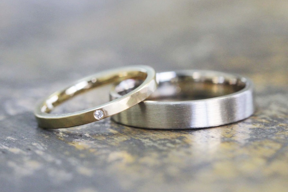 手作りなら、幅・指輪の形状・厚み・サイズ・素材・仕上げ(鏡面・つや消し・槌目など)を細かく決められる。既製品では「決められた形状」しかないことが多いけど、手作りですと「自分たちの手や生活にしっくりくる形」を作れることが出来ます。特に実際に制作しながらサイズの調整が出来るのは手作りならではです。試着して「少し緩いな、きついな」といったことがあればその場で0.5号単位でサイズ調整が可能です。