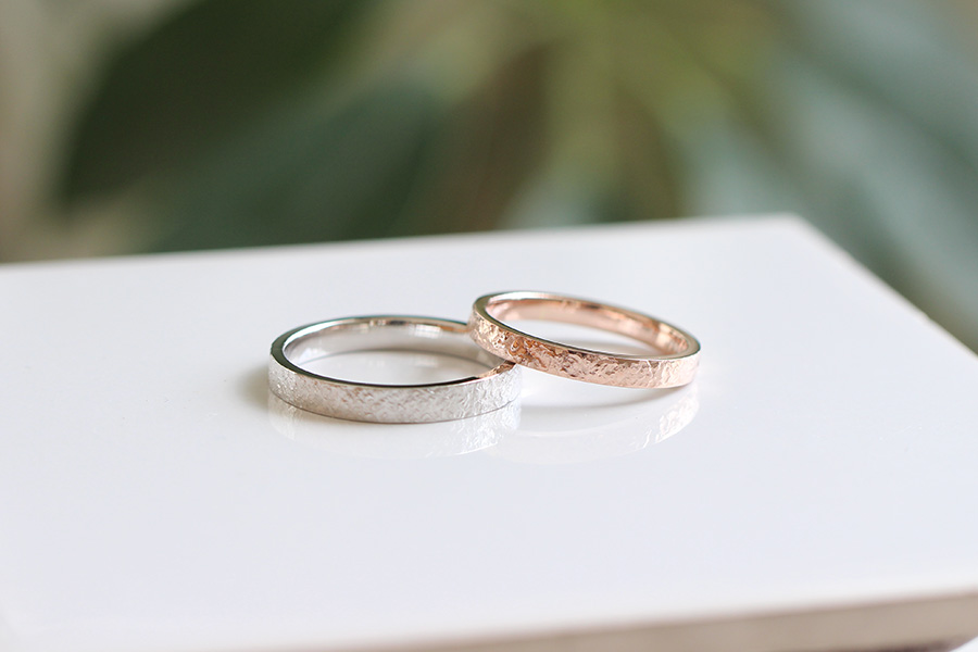 槌目の模様部分は少し細くなってしまいますが甲丸型の強みの丸みがあることで着け心地も良く手作りで着けた自分たちの模様を入れることが出来ます。