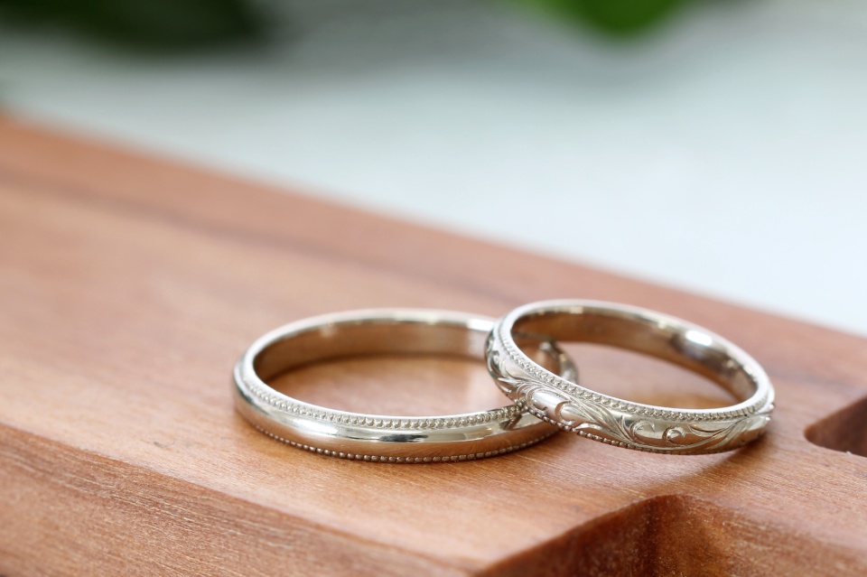 K18ホワイトゴールド 甲丸 3㎜幅 鏡面仕上げ ミル打ち 手彫り