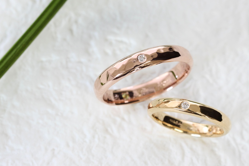 K18ピンクゴールド 槌目(甲丸) 4㎜幅 鏡面仕上げ ダイヤモンド
