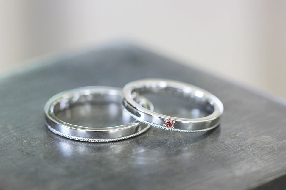 プラチナ 平打 2.5㎜幅 鏡面仕上げ ミル打ち ガーネット
