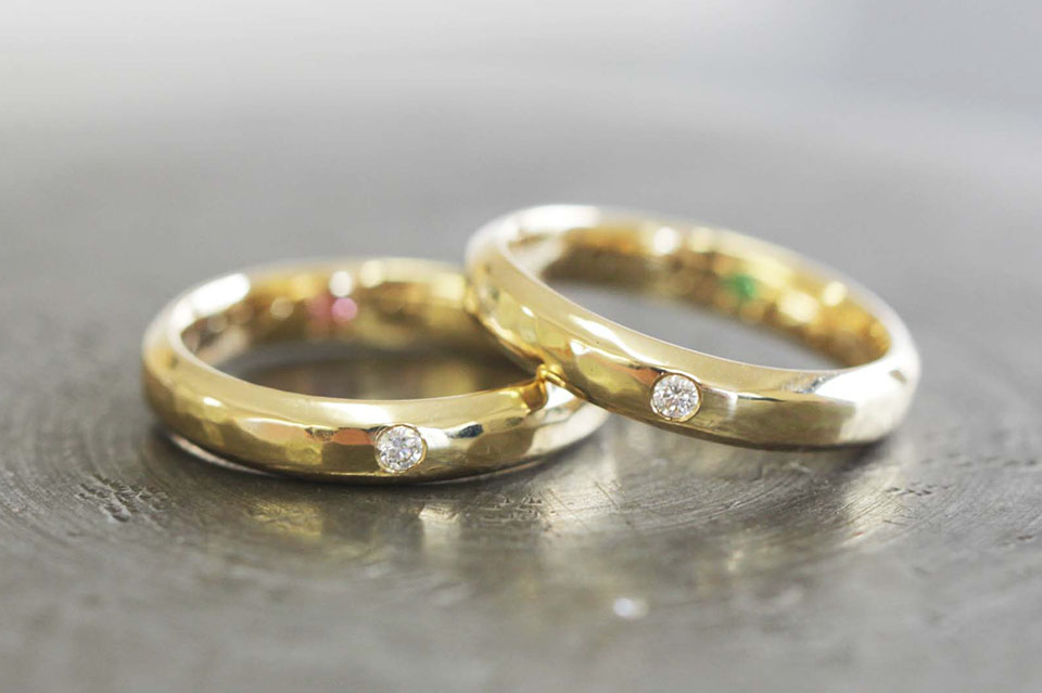 K18イエローゴールド 槌目(甲丸) 4㎜幅 鏡面仕上げ ダイヤモンド エメラルド