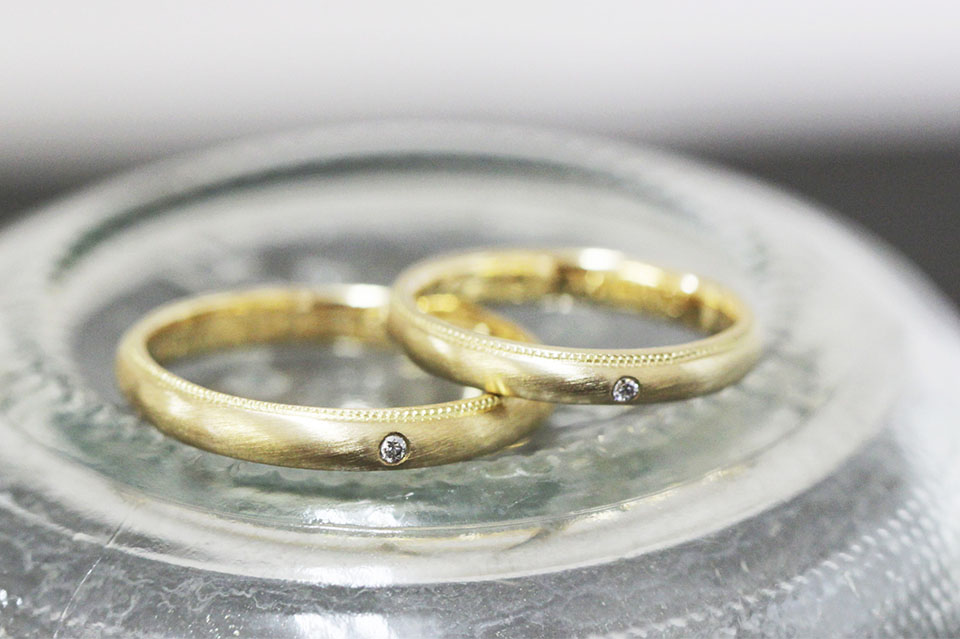 K18イエローゴールド 甲丸 3㎜幅 マット加工 ミル打ち ダイヤモンド