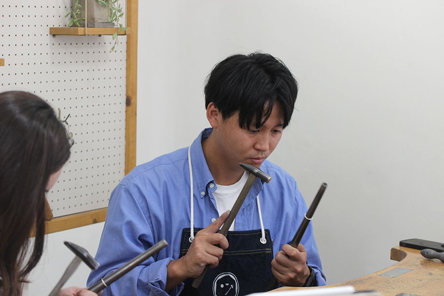 準備が終われば、シンプルな指輪に個性を打ち込む模様付けの作業スタート。