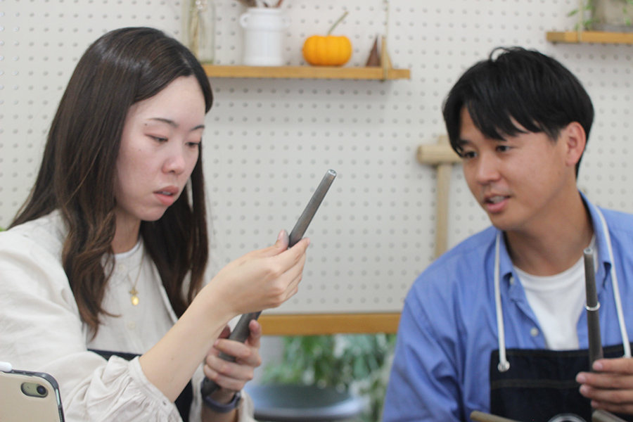時折模様と指輪サイズの確認をしながら、お二人で満足のいく品を目指します。