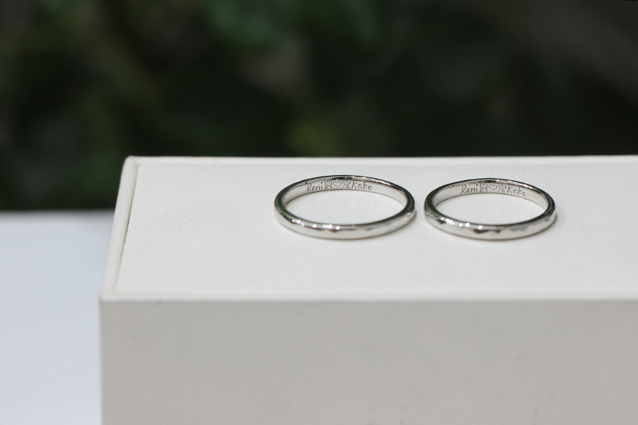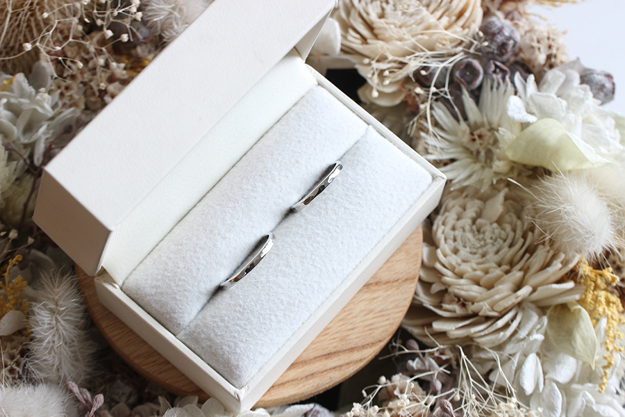 「結婚指輪といえば!」とプラチナの素材で表面が丸い甲丸の形をイメージしていらしたおふたり。実際にご来店してもらいサンプルを見ながら決めていただくと「キラキラしていてかわいい」と槌目模様にも目を奪われて。