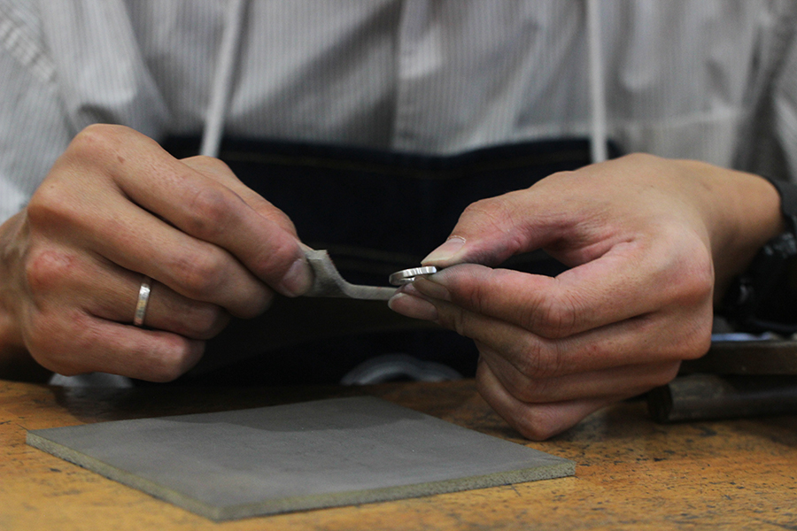 表面がヤスリのスポンジを使い、指輪の表の部分を磨きます。
