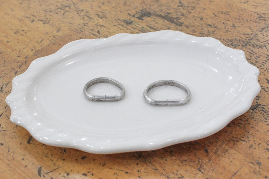 この状態だけ見るとまだ指輪のまんまるな形のイメージとはだいぶ異なりますが・・ご安心ください!これから叩いたり磨いたりすることで、綺麗な指輪を目指していきますよ♪